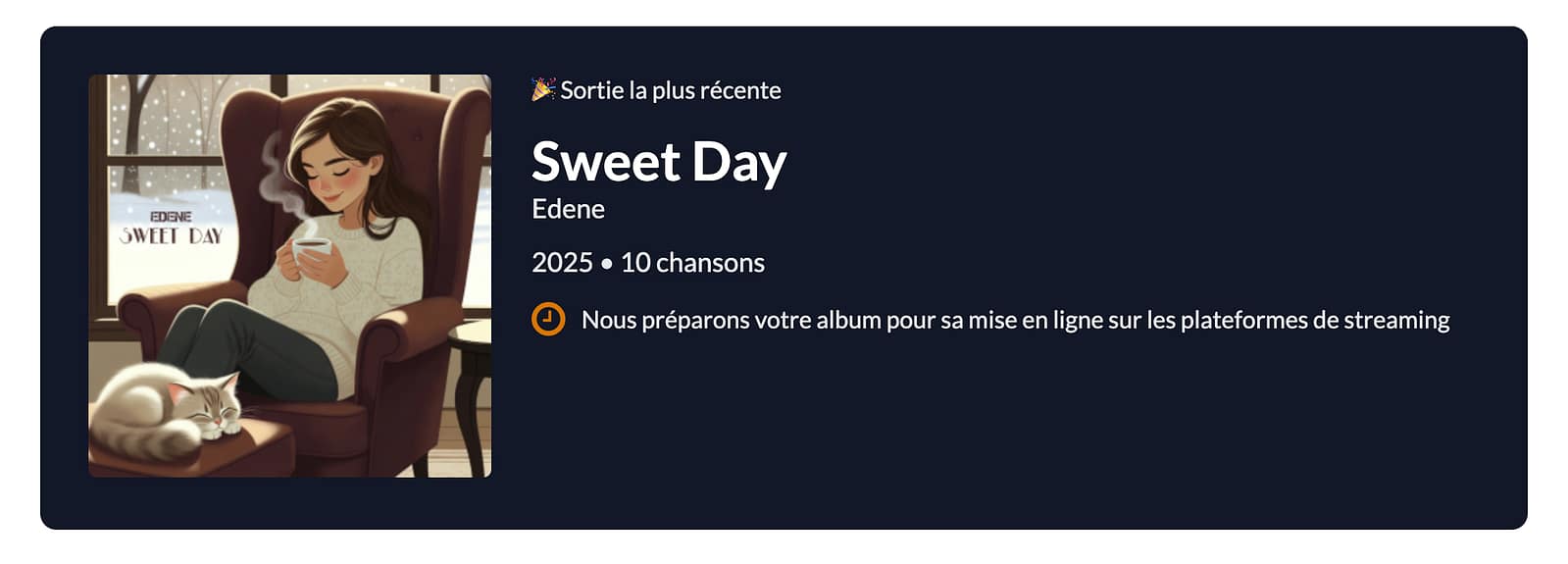 Avec Sweet Day, Alexandra Edin poursuit une tradition devenue incontournable dans son univers artistique : offrir, chaque fin d’année, un écrin musical empreint de douceur, de chaleur et de poésie hivernale. Composé au cœur des studios EDENE PROD, cet album Lo-Fi rassemble dix instrumentaux délicats, pensés comme de petites fenêtres lumineuses ouvertes sur l’hiver.